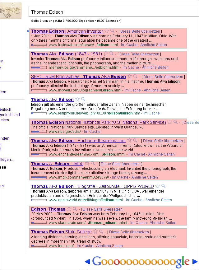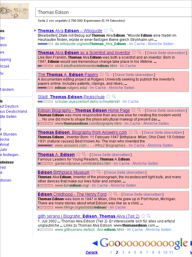 Aus aktuellem Anlass habe ich exemplarisch die ersten drei Seiten zum dem Suchbegriff „Thomas Edison“ gescreenshotet. Die englischsprachigen Ergebnisse sind rot eingefärbt. Schaut selber: