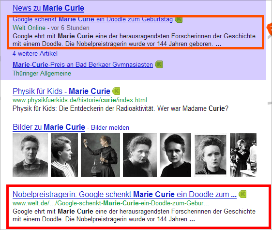 Vor einigen Tagen hat Google angekündigt, dass Freshness (Aktualität) nun ein Rankingfaktor werden soll. Marcus Tober hat unverzüglich einen Artikel hinterher geschoben, der zeigt, welche Veränderungen sich dadurch ergeben haben. Auch einige Stichproben zu aktuellen Begriffen haben deutlich mehr News-Beiträge in den normalen Serps gehabt als üblich. Es liegt also nahe, anzunehmen, dass der um Freshness erweiterte Google-Algo bereits am Laufen sei. Nun zeigt Google heute ein Doodle-Logo zu Ehren von Marie Curie. Was liegt näher, als sich mal anzuschauen, wie sich das Freshness-Update da auswirkt.